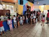 , entregando os pacotinhos de doces e os presentes às crianças. A alegria e os sorrisos encheram a escola de amor e esperança.